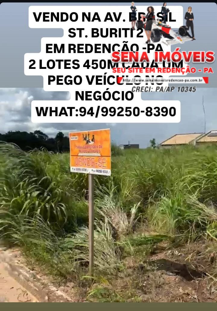 Vendo 2 lotes de 450 m² cada um = 900 m² na Av. Brasil do St. Buriti 02, próximo ao hospital regional em redenção-pa.
